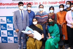 Dr. Srinivasan Paramasivam elaborated on the procedure, “Successful embolization was carried out by approaching through the umbilical artery and using cardiac pacing. This is a novel technique to temporarily stop the flow of blood in the bodies during surgery, for inducing hypotension to aid in controlled embolization. This technique has been used in combination with brain embolization only a few times across the world. The procedure was performed in the Cath-lab at Apollo Hospitals, Greams Road, Chennai. Post the emergency procedure the baby has recovered and is doing well.”