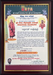 On behalf of the Hindu Religious Forum, Sri Kanchi Kamakoti Peedathipathi Jagadguru Sri Sankara Vijayendra Saraswati Sankaracharya Swamigal presented a award to SriJagadish Kadaval as “Bharatiya Kalachara Seva Mani” in honor of his religious and social activities, and the Ilavarasu Pattam PT Ramesh awarded “Alaya Agama Arappani Semmal” at the Veda Agama Thevara Spiritual Cultural Conference held at Thiruvannamalai.